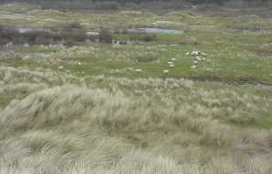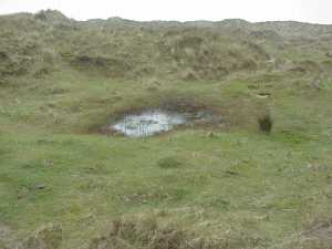 The dune slacks are found in between the more mature dunes where the water table reaches the surface causing seasonal or even permanent waterlogging and surface water. Plants which are well adapted to these damp, sheltered hollows include rushes, sedges, cotton grass and creeping willow. If decay is slow, a peaty soil may develop. |
