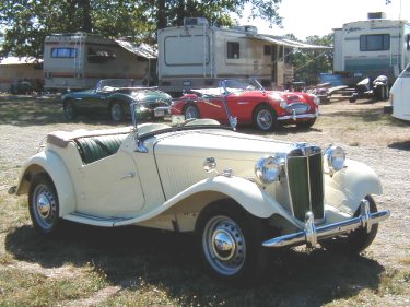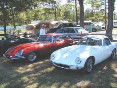 trees in the shade are a fine E-type Jaguar and a Lotus Elite. |