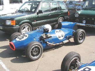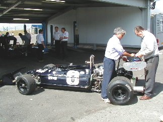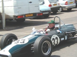 Rodger Newman brings the Brabham BT14 back from Scrutineering. |