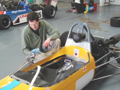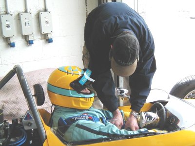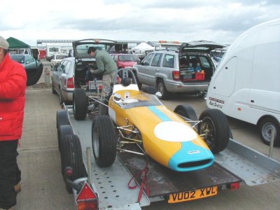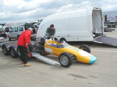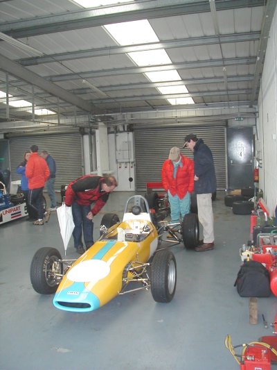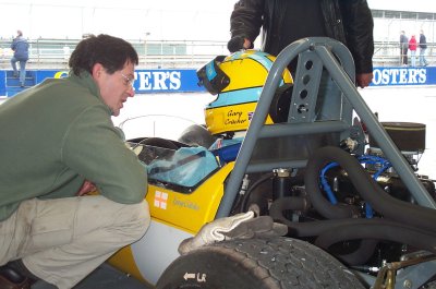 Well, this was it. After something like four and a half years since I originally bought the racecar from a website in America, it was now time to actually get the thing out on the track. We were aiming for the HSCC's Donington Park meeting in April but missed that by a mile. Silverstone was the third meeting of the year. To say that I was nervous is probably the understatement of the century!! What with being my first race and my first time out in the car, add that I had never even SEEN the Silverstone International Circuit before (it's about half of the Grand Prix circuit), it was going to be a bit more difficult than I thought. then, of course, something else happens too : it rained!! Well, silly me, what was I expecting from England at the end of May??? Some sunshine perhaps?? No such chance!! We decided to take advantage of a test day on the Friday before the meeting proper, it was a good job we did!!