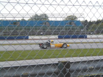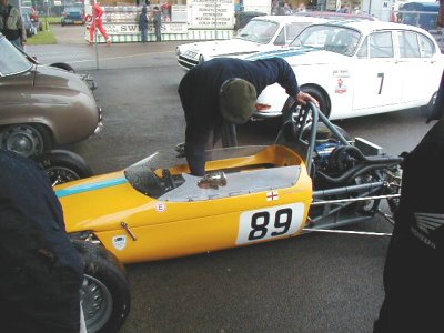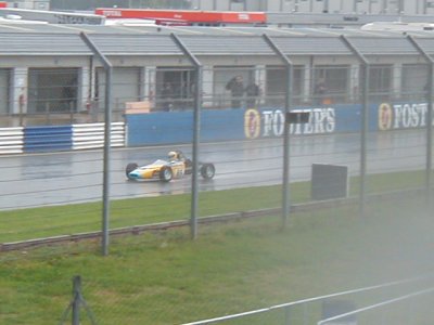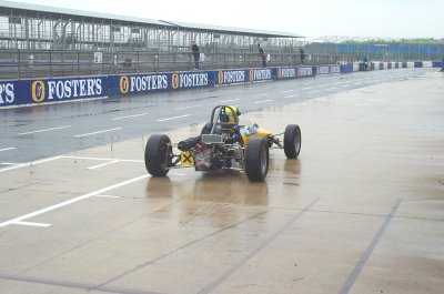 Practice / qualifying was just around Sunday lunchtime and was just about dry. At least I qualified, albeit dead last. What were you expecting? Another Schumacher?? Race was at 4.30 and we were hoping that it MIGHT have dried out a little by then. WRONG! As we came round from the warm-up lap, all I could see beyond the grandstands were absolutely BLACK clouds!! Great. The green lights came on and off we went!! After only a matter of maybe 200 yards I was suddenly driving though debris. Two cars were stuck in the barrier on the left, right ion the middle of start / finish straight. The spray was amazing, I had never experienced anything like this before, visibility was absolutely zero. Half way round the lap we got red lights and red flags, race stopped. We formed up on the grid again while the two crashed cars were removed. After what seemed like an age but was only probably about ten minutes off we went again, I got a better start but it didn't seem to get me any nearer the car in front!! At this point the rain was horizontal, it seemed to be hitting the track and bouncing up three feet before coming down again. Those of you who have visited Silverstone will know what I'm talking about! I kept hold of the guy in front of me and was even thinking about overtaking him for a couple of laps, but what with aquaplanning down the straight (I kid you not!), I eventually came to the conclusion that it was probably better to finish than to try & overtake someone and ram him from behind because I couldn't see him. I left it at that and brought the car home. So, in the end, was it fun?? Well, yes, sort of. It was absolutely brilliant to be out in the car at last, especially after the fantastic job that Jonathan has done on it, but the weather was SO bad I couldn't enjoy it, I was concentrating on not pranging the car! I am next out at Brands Hatch on the Grand Prix Circuit in early July, and am I looking forward to that?? You bet I am! I'll report on that soon.