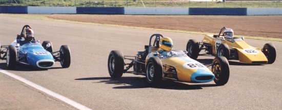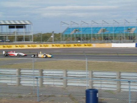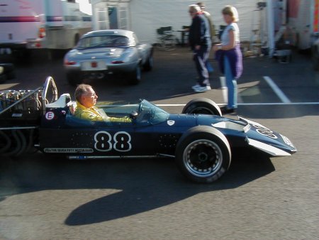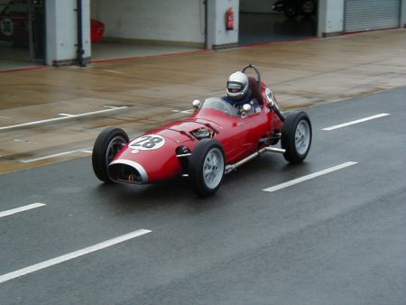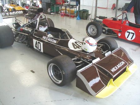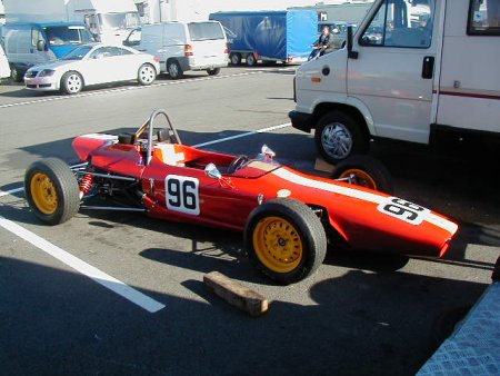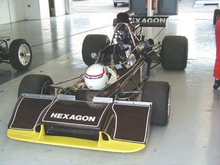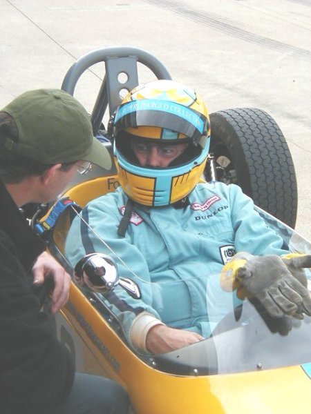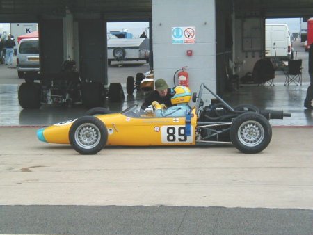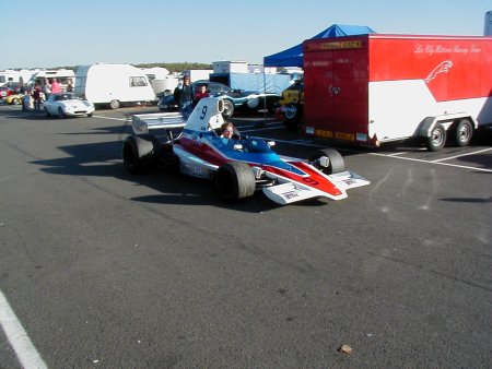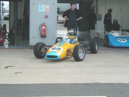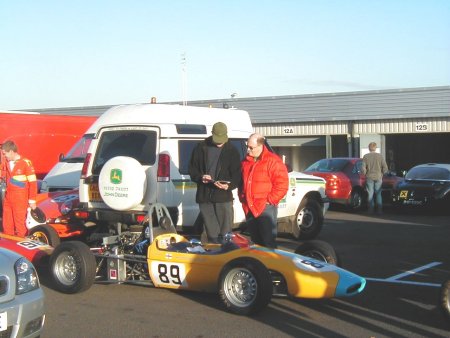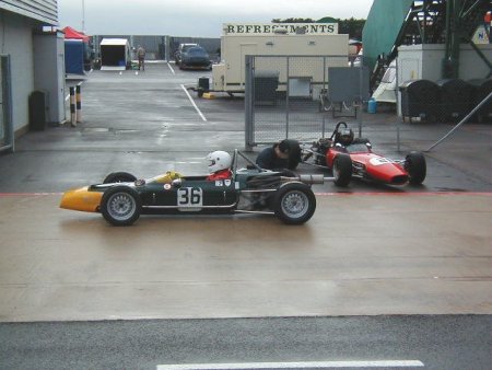 Well, believe it or not, the weather this year was absolutely spectacular! I remember this meeting from last year when the temperature must have been 5 degrees below zero, and yet this year I literally walked around in my shirt sleeves! Unbelievable. I had a decent test day on the Friday before this meeting, which was just excellent. I had thought it was a test day for just us 'historics', but it turned out to be an 'open' test day. Imagine my horror when I saw at least TEN Formula Renaults getting ready to go out - in MY session!! There were a load of different single seaters there, from Historic Formula Juniors, to Formula Fords (old AND new) and the afore mentioned Formula Renaults. Can you imagine the speed difference from one of those to one of my things?? 'Oh well', I told myself, 'I'll just have to keep my wits about me.' In the event, all went OK, in fact the hairiest moment for me all day was in the pit lane, when one of the Formula Renault guys over-took me on the RIGHT hand side as I was coming in after a session! Kids!!! Here's a couple of shots from the test day.