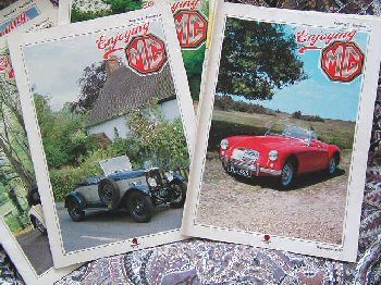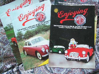This is what I have to sell in total : ENJOYING MG (the magazine of the MG Owners Club) 1983 - July, October, November and December only. 1984 - complete. 1985 - complete. 1986 - April and May are missing. 1987 - I have February, July, August, September, October and November only. 1988 - December missing. 1989 - complete. 1990 - complete. 1991 - complete. 1992 - complete. 1993 - November and December are missing. SAFETY FAST! (the magazine of the MG Car Club) 1991 - I have May, August, October, November and December only. MG ENTHUSIAST (a magazine that you could buy in the shops) June 1991 and January 1993 only. As I want to get rid of these, if you are interested, I would like just £5 per year. If you are interested another others, I'm sure we can come to some arrangement (i.e. postage plus a little something). All magazines are in good condition.. Contact me at gary@yesterdaysracers.com |