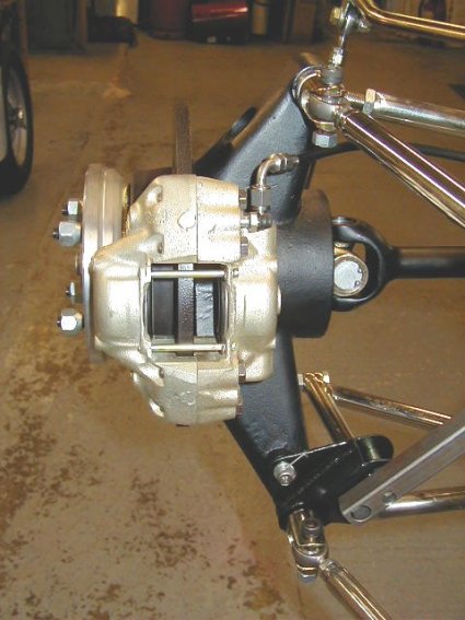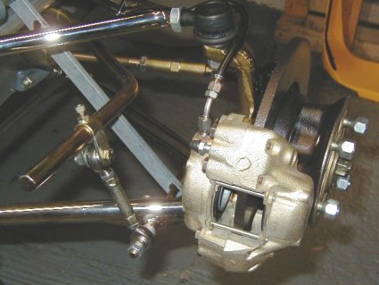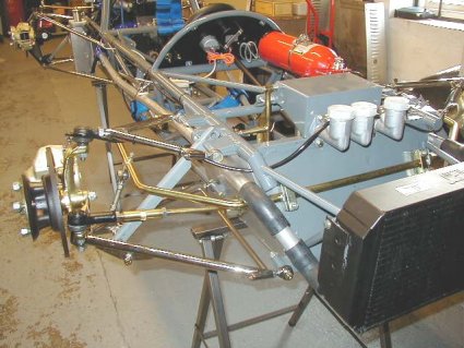 Here's a view of the car without bodywork. We have retained the original radiator, but you can see the new water line running into the bottom of the rad from the rear of the car. The fire extinguisher is new also.