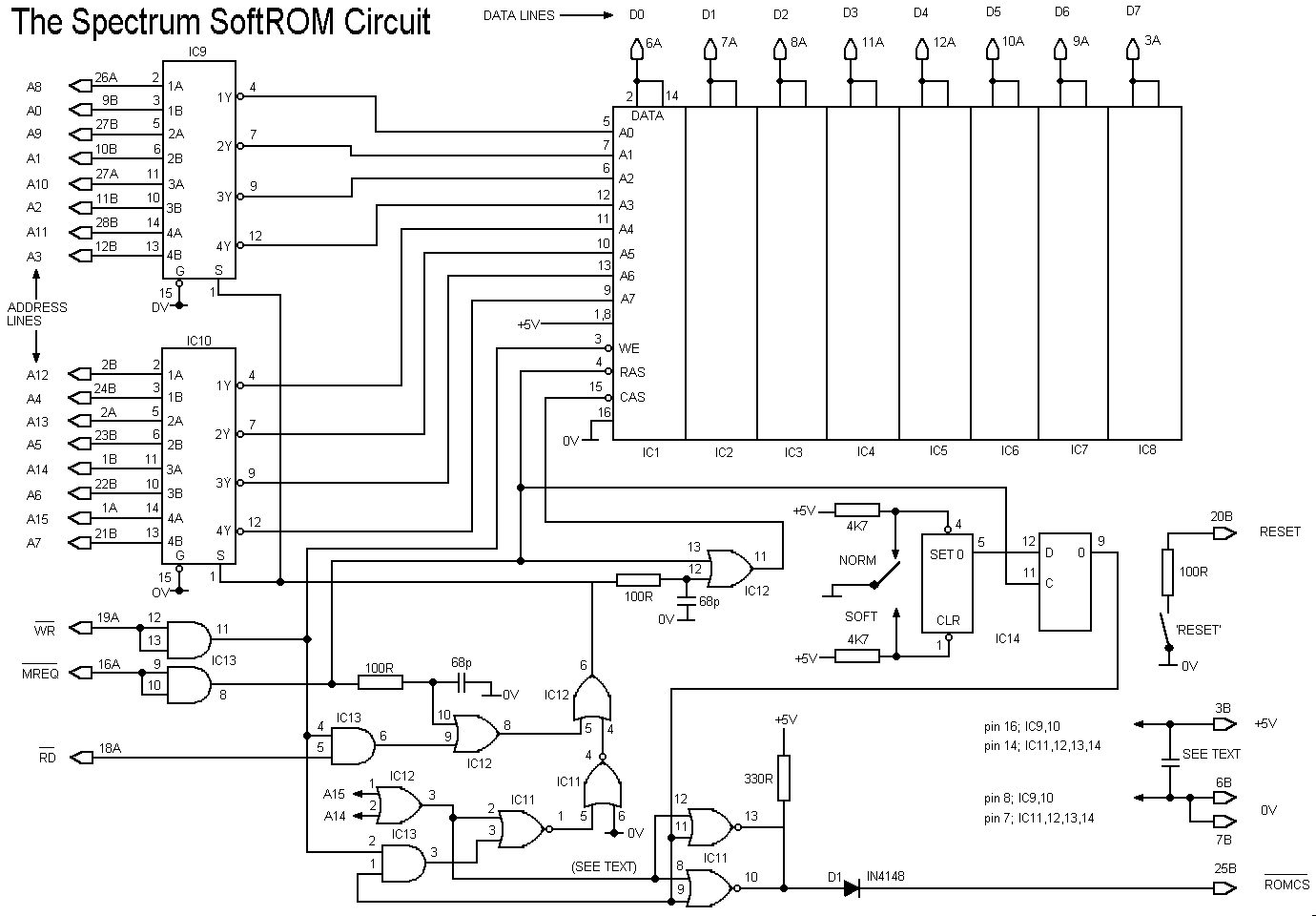 | The Spectrum SoftROM Circuit Mike Lord's favourite method of construction for this type of circuit is to build everything on a piece of veroboard to which a 28+28-way Spectrum edge connector can be Araldited. | ||||||||