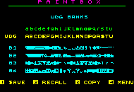 Opt for UDG Editor and you're given a further menu which allows you to view existing UDGs, create new UDGs (using Paintbox's Drawing Board) or to go to Sketch Pad. Other options allow for LOAD or SAVE of UDGs from/to tape, the final one being to return to the main menu. Option 1 - View UDG Banks - displays four sets of UDGs already in memory; you can choose one of these for use with further options. The four banks are (a) a submarine, (b) a warship, (c) aircraft and (d) buildings, trees and vehicles. Also displayed are any UDGs you've already created using option 2 - Drawing Board. This gives you an eight by eight box within which to create your own UDG characters; you can call from |