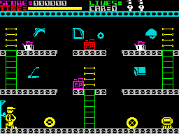 anything!' Wally's first job us to go along to the stores and collect the first part he needs - however, this is no ordinary storeroom. Most of the spare parts have taken on a life of their own, rolling about menacingly (if you can call a gentle rolling movement 'menacing' that is). Anyway, avoiding these, Wally must climb the ladders and jump across holes in the crumbling floors until he finds the part he's looking for; once he's got it, it's back to where he started. Thus, the game continues until the first car's built ... and then it's on to the next car. Whew! |