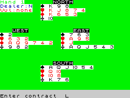 understand most of the finer points! The program works by dealing the pack to all four hands, but there is the restriction that no more than eight cards of one suit can appear in one hand; this is due to the graphical layout of the cards on-screen. Once dealt, the bidding begins and follows the Acol system, with commands such as '5C' being interpreted as a bid of five clubs; however, as the human player, you always play south and enter the card you wish to play with the suit first and then its value. Some nice refinements are the automatic play of cards if you have only one |
