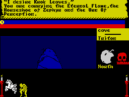 | The text window shows what's going on and what you're carrying - in this case the Eternal Flame, Horseshoe of Zephyr and the Urn of Perception - in usual adventure style. | Watch the numbskull ... It's a clock! When it rises completely out of the flames, it's midnight and the Krillan hordes take to the street looking for action. Best to REST until daybreak. | |||||