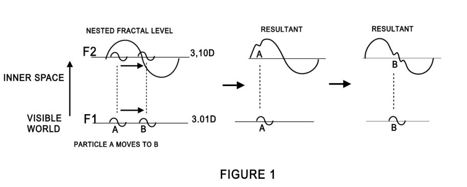 The simple diagram of Figure 1 shows two fractal levels F1 and F2 and the geometric relationship between them. Remember F2 is a higher aspect of the manifestation F1. Level F2 is represented by the larger sine wave, and F1 the smaller one. If particle of frequency F1, at A, moves to location B, its phase relationship with F2 is changed. Since F2 has F1 as part of its holistic resultant or collective state, then F1, as an apparent separate element at its own level is known in location by F2. (F1 may be at, say, 3.01D---it must be greater than 3D to exist---this is corroborated by logical dimensional arguments.)