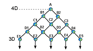 The spectrum of identity for a particle (or a human being but much more complex) may be A B1 C2 D2 E3. Remember this may be a small sectional element, which is part of a greater configuration or matrix, or a broad representation---just a framework for the full range. This is also a programme; the programme, say, to create a particle or an atom. Again, level A may be the universe, B1 a particular galaxy (we've skipped clusters), C2 a star system, D2 a planet, and E3 an atom. Thus its location (e.g., particle) is known by the other levels by phase relationship (as per Figure 1). Note that in this example, even though an atom is holistic basically, it can have a complex structure if it is 'broken down' or quantum reduced'. Thus E3 will be found to contain apparently separate particles, electrons, protons, neutrons, and many more particles if searched for. Thus in this case, to be more realistic, one could re-use the whole of the matrix but now let E3 be in A's position (even though E3 and its surrounding elements stay where they are); this is to provide the detailed structure of the atom (that is, level A attaches at, and becomes, E3) and utilise all the potential elements or probabilities with this matrix.