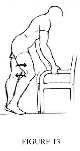 Figure 11 technique is an action similar to that when an athlete runner stands on one leg and shakes (out the tension of) the other leg. However, the intention of the runner is simply to remove any fixed/stuck tensions, whereas the intention here is to deliberately make movements but at a lower tension. Leaning on the chair enables one to reduce the tension in the legs.