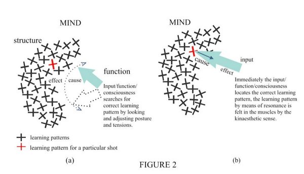 In Figure 2 the subtle relationship of cause and effect between the structure (learning patterns) and function (consciousness) becomes impaired. The automatic learning patterns/programme becomes to dominant; function gives way, more and more. Since function is already automatically feeding the learning-pattern structure it will now fail to provide the necessary energy to keep the structure proficiently active, and we now have not just a plateau of ability but a deterioration (Figure 1).