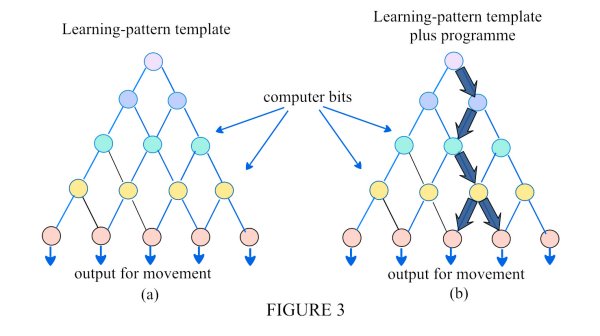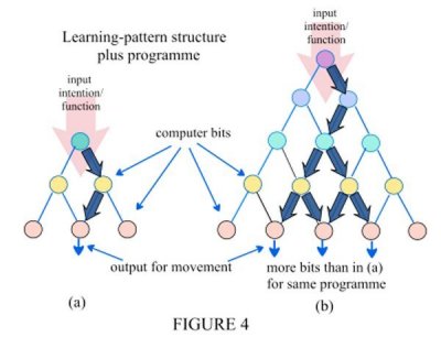Figure 4(a) and (b) shows different template developments with the same programme (same movement). Clearly (b) has more bits available for the programme and will give greater accuracy. Thus Figure 4 gives us an understanding of what happens within the computer system as skill improves; that is, expansion occursthe programmes simply give the specific paths (movements) traversed. This expansion means that the function is required less and less. The robot' mechanism is making the movement for us' (the sentient input/consciousness/function) and we in effect let go. But we are still in control since the learning pattern will respond instantly to the function's thoughts.