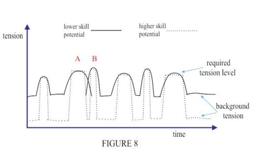 One is encouraging this lower tension state since the higher level of skill (which, say, will be achieved in the future) requires less tension for the same power and speed. The higher level of skill brings about increasing degrees of replacing physiological muscular tension (brute force) with quantum field actiona non-force harmonic system housing learning patterns and programmes (not remotely recognised by current science).