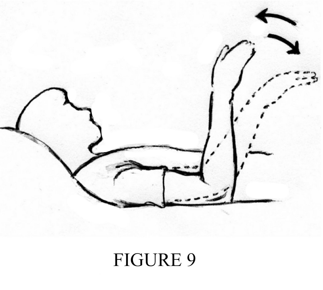 Figure 9 exercise is actually similar to that in Figure 6, but since the arm is resting (preferably on, say, a mattress so that the elbow can move up and down a little) this allows the exercise to be performed in a more relaxed mannerless tension in the muscles. This would be used