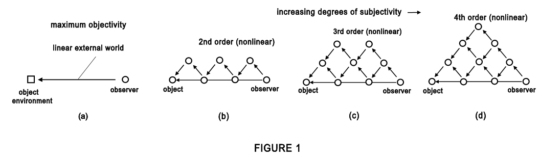 Figure 1(a) would give maximum objectivity (which in the limit is linearity) but (d) would give maximum subjectivity (nonlinearity in the limit). Between these two extremes is the gradient. But as the reader can see, the linearity is an illusion since the hierarchy behind itFigures (b) to (d)exists always but is unconscious, manifesting apparent objectivity. 'Objectivity' is synonymous here with 'unconscious' (the unconscious connection to the object). As one shifts from Figure 1(a) to (d), comprehension goes from external to within (inner space).