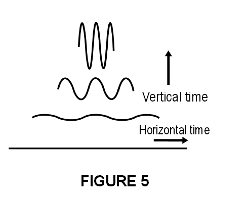 Clearly from what we have described so far, horizontal time is the linear, regular and constant aspect, and the vertical is the nonlinear variation as we move into inner space (the groundfloor workers to the president). Figure 5 shows a straight horizontal line of a set length representing linear time. We envisage compressing it at either end to cause the folding up, or waves. We see that gradually the line is occupying more and more nonlinear vertical space and less and less horizontal linear space. This is just a manipulation of geometry but nevertheless we see the line or extended objective time compressed towards a point, representing no time (actually at the top of the scale) and in doing so the waves go into higher frequencies---the actual situation. Thus the highest forms of time, that is, vertical, could be considered to be in the direction of higher frequencies, which is the path of true evolution/ascension.