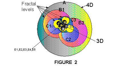 Now, after understanding what Figure 1 represents one should then translate it into Figure 2 which is a more accurate rendering of the true physical layout or hardware. (A more complete understanding of the physics of this multidimensional unit is given in the article on the basic energy unit.) We can say briefly that each sphere in Figure 2 spirals inwards branching off into smaller spheres and increasing in number. The stable fractal levels are formed because each sphere is 4D at the surface and therefore (in terms of 4D geometry) has two spirals towards its centre which become in opposition and meet internally, creating a stationary quantum state (oscillation). Thus as a sphere spirals in it meets its own opposite spiral (not shown in the illustration), which can occur at any level in the gradient 4D to 3D.