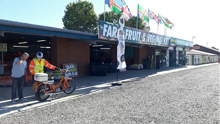 We carried on and while we were heading for our next meet up with Matthew there was an incident and the rear of my bike received a bit of damage but Keith’s Townmate came off worst with bent forks;, then it rained. We met up with Matthew and it hammered down; fortunately he had pulled up at a small farm shop with a tea room. Keith’s bike was deemed unfit to ride and it was loaded on to the trailer and the spare Moby was pressed into service in the rain that had eased—but we had to get on.