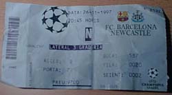 The Nou camp should be renamed the old camp . It is a huge crumbling hovel not fit for decent geordies to sit in. The seats were soaking wet and didn't fold up, so they had to stand up. There was no cover to shelter under so the fans got soaking wet. The isles were cramped and refreshments were sold out of little baskets by the locals, all in all the facilities were not what we are accustomed to . It would not have been to bad but the tickets cost an incredible £45. The ground would hold 116,00 Newcastle were allocated 3,500 another 3,500 went along in the hope of getting a spare seat, no worries there were 100,000 spare seats it was deserted.the fans still had to be put on the top tier about a mile away from the opposing fans who were all sheltering quietly under the lower tier.