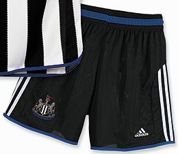Newcastle United's new Black and White home kits will be available a week before the FA cup final. They have done away with the tight round neck, the awful shield on the back .The shirt now has a V neck and collar. Blue piping on the collar and sleeves. The shorts are similar to the old design but have a blue trim. . The socks are as expected now white, although there are also blue and blacksecond socks.