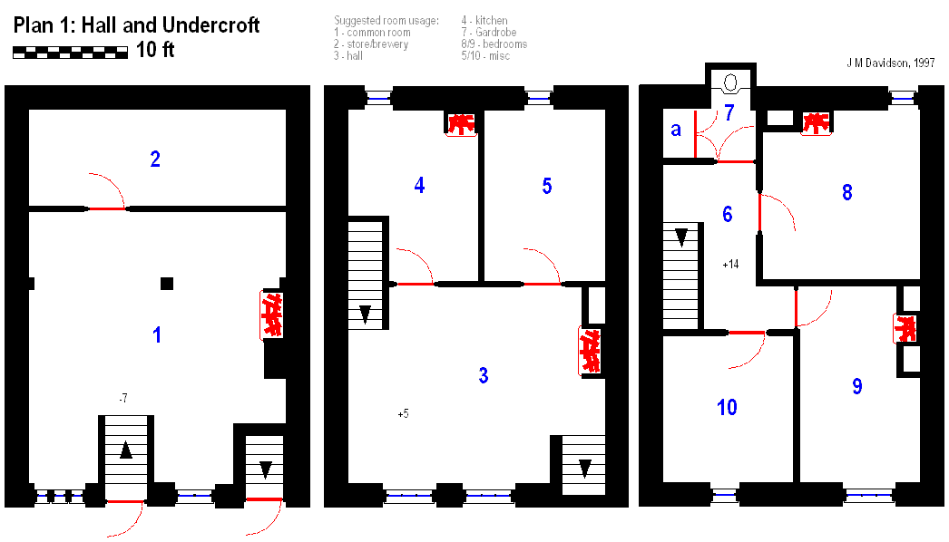 This building has two main wings connected by a smaller central section. The larger wing is hall used as a common room, the rest of the building is given over to accommodation and stores, with a small loft area. This could be a purpose built inn, or one made by knocking together two standing buildings.