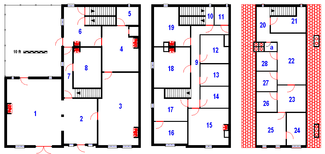 Note these plans are outline, and do not have doors and windows drawn, nor are they furnished. Room function is also not indicated to allow the greatest flexibility in your description. Normally the largest room will be the common room (bar). Cellars can be added to all the plans, just indicate in the description where the trap door is.