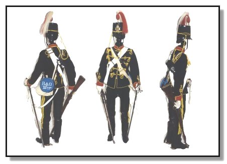 The regiment was originally formed in 1715, and was known as Dormers Dragoons. In 1751 they were officially called the 14th Dragoons, and in 1776 converted to the 14th Light Dragoons. In 1830, following a review by King William IV, they were given the honour of being re-named 14th (Kings) Light Dragoons. Following the Crimea War, changes were made in cavalry dress, as they had been in infantry. The loose tunic replaced the coatee, and "booted" overalls were worn by all mounted troops. (With the exception of the Household Cavalry, who retained their tall jack boots). Light Dragoons wore the new Albert second pattern shako with a horse-hair plume, and five lines of frogging across the front of the tunic. (Hussars had six lines). After 1849 all cavalry wore two yellow stripes on their overalls. When Light Dragoons converted to Hussars in 1861, this regiment became 14th (Kings) Hussars. |