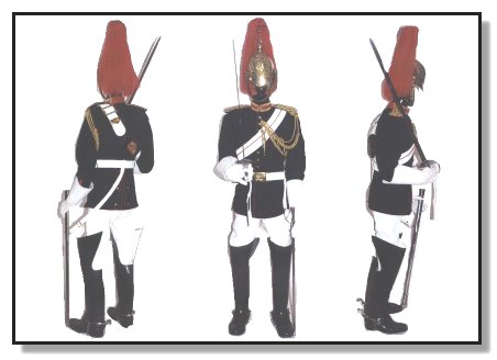 The Royal Horse Guards (The Blues) were directly descended from the regiment of horse raised by Cromwell in 1650. With the restoration Charles II took the regiment for his own, styling it the ?Royal Regiment of Horse?.. The colour blue was associated with the regiment from its early days, but it was also the colour of its first commandant, the Earl of Oxford. About 1690 they were nicknamed the "Oxford Blues", and this name became stylised in 1750 as "The Royal Horse Guards - (The Blues)". In 1820 the Blues were given full household cavalry status, until then only enjoyed by the Lifeguards. In 1969 they were amalgamated with the Royal Dragoons (1st Dragoons), to form a new regiment in the household cavalry known as the Blues and Royals. The uniform displayed is almost exactly as worn today, apart from the alteration of all insignia from Victorian to ER II and without the eagle, which is now worn on the left arm since amalgamation with the Royal Dragoons. |