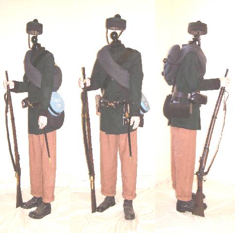trained and wore the woodsman's traditional green costume In 1797 a special battalion of riflemen was added to the 60th Regiment comprising about 400 men, and for the first time, a green uniform was worn in the British Army. It proved a success and very quickly the green was adopted by riflemen in the other battalions The success of riflemen in the 60th Regiment must have inspired the authorities to find a corps of riflemen. Thus in 1800 the Rifle Corps was formed from the 95th Foot and some other regiments. In 1802 it was renamed 95h (Rifle) Regiment and from 1816 until 1862 was called the Rifle Brigade During the Crimea War the Brigade earned no less than eight Victoria Crosses The uniform of all Rifle regiments has always been made of a very dark, almost black, (rifle)green material with black buttons.In 1855, as well as his new style double-breasted tunic, which replaced the coatee, our model is wearing the linen "sandbag" trousers which were issued as a working dress in the summer of 1855, together with a tunic of the same material. From the pictorial evidence of the period, the linen uniform seems to have been chiefly worn on working parties or off-duty. However, a water-color of Riflemen parading in the trenches shows the linen trousers being worn with the new rifle-green tunic. The waistbelt, shoulder belt, and various accoutrements are made in black leather and he is carrying his greatcoat "en-banderole" . He is wearing the undress Kilmarnock bonnet in Rifle green with a black woolen torrie. The rifle is the Enfield 3 band rifle with a black leather sling. |