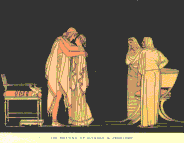 Next morning you go to surprise Laertes in his hovel. You can't resist winding him up to start with, but finally you reveal yourself, and there is a touching reunion, with all three generations united at last. While with Laertes, you are attacked - by the Suitors' families. Athena encourages you all to fight. However, the battle has no sooner begun than she stops it again, on Zeus' orders. But you can't stay in Ithaca enjoying yourself.You must obey Teiresias' insructions, and go off on your travels again in order to make your peace with Poseidon. Only after that will you be able to settle down with your family and live happily ever after. JUST ONE FINAL PAGE |