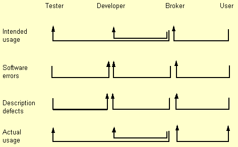 Intended and actual use should be fed back to testers as well as developers. Errors and defects should be fed back to the developers by the users, via intermediaries with responsibility for software distribution, such as software publishers or software brokers. They may also be fed back to the testers (since they provide some feedback on the thoroughness and relevance of the testing). Other users may want to be notified, not only of any outstanding software errors and description defects, but also of the pattern of error rates and defect rates, from which they may want to make judgements about expected future error and defect rates.