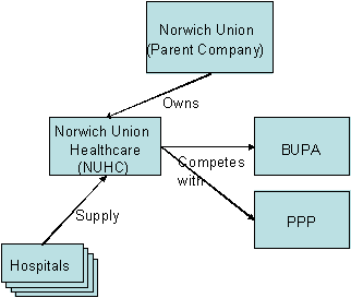 | During the late 1980s, a large insurance company, Norwich Union, decided to enter what was a new market for them, Healthcare. They did not know whether they would succeed in taking significant market share off the existing players such as BUPA and PPP so they started a new company simply called Norwich Union Healthcare (NUHC). This new company had an independent board but relied on the parent company for investment. | ![]() |