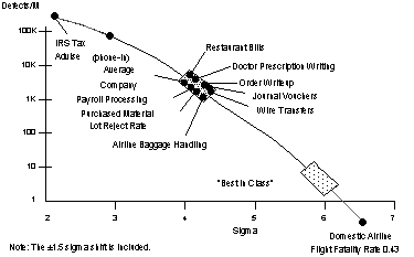 Many large airports have 200 flights landing each day. A one per cent error rate in landing means that every day two planes will miss the runway. This is clearly unacceptable. If, reluctantly, we accept that two misses in eight years is in some way unavoidable then we are accepting an error rate of 1 in 292,000 (3.4 errors per million). This is the six sigma level.