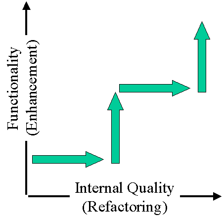 Refactoring is primarily an internal change to an artefact – it doesn’t (or at least shouldn’t) change the behaviour. The refactoring method assumes that the system works more or less correctly, and includes thorough testing to compare the behaviour before and after the change. If the system or component doesn’t work properly in the first place, you can’t refactor it – you have to debug it or throw it away. And if you want your system to accommodate some new requirements, or change its behaviour, that’s not refactoring either – although you may well perform some refactoring as a prelude to or part of the enhancement. Indeed, Fowler argues that best way of enhancing a software artefact is often be to alternate refactoring with the functional increments, as shown in Figure 1.