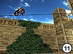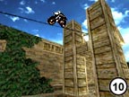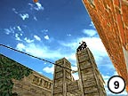 9.) Miraculously you should land on a needle-point with your brakes on at the top of one of the towers, and all being well, you should be lined up for the tricky bit. Don't look down. . .don't breath. . .don't look into the nudist camp across the next field which you can see from up here (Unless you're one of those NudeRs. . ). Aim the front tyre of your bike (which is about 4 inches in width) onto the thin steel rope (which is no-where near about 4 inches in width). On no account land in any way whereby the aforementioned steel rope can come into contact with you happy-sacs and/or dangly bits. This can be "very painful". It may be a sensible idea to bring a "box" along with you next time. |