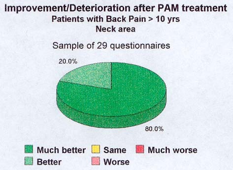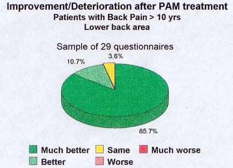 PAM patients were invited to fill in a questionnaire including information on what part of their body was affected previously, and quantify any improvements or deterioration there might have been following a course of PAM treatments.