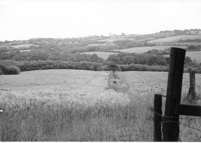 Looking down across the field as the footpath from Ivy House Lane to Rock Lane drops down into the valley, soon to cross the Ashford railway line at the Iron Bridge. This is how it was in 1964. The oak tree was cut down some years later.