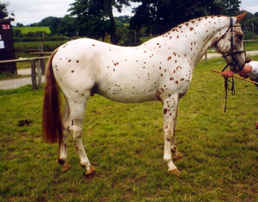 Classic Rasputin is the only British Appaloosa Approved Grade A (Five generations of Appaloosa breeding) Stallion in the country. His sire Ulrich's Buckaroo imported by the Alder Stud in Dorset from Wyoming USA in the early 90's has 17 generations of selective leopard Appaloosa breeding. His dam Eagles Pipermint Paty was imported from Canada by ourselves in the late 80's for her impressive breeding, which goes back to OLD PAINTER, PATCHES and KNOBBY, which were influential foundation sires that pre date the American Appaloosa Registry. Her blood lines include RED EAGLE a prolific winner and sire of world champions like STORM CLOUD F.