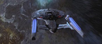 Dvd films : Having recently got a DVD Drive and Player, I have to recommend everyone to get one...they are cool and are far better than normal video and the extra features make up for the extra cost...here are some pics, there will be more in time, if I get the time. On the right we have the Enterprise going back in time, this shows the wide screen format common to most DVD's. |