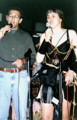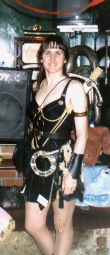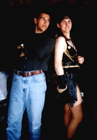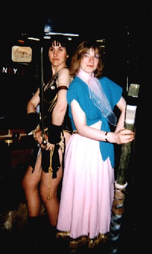 SATURDAY This day came far to early! We were tired! I busked a 'hello' to everyone on stage for a while until the first part of 'Net Force' rolled. I think Scott was more popular than me! The videos rolled happily until just after lunch when John made his first official appearance. He talked warmly for over an hour, then retired to sign autographs. I spent much of this day walking around and quietly checking that everything and everybody was happy. I did manage a change before the evening disco, when Penny and I became Xena (me) and Gabby (her). Now most of you are probably aware that John has been in an episode of Xena (he was Ulysses), so it was with some amusement (and nervousness) that I waited for him to come to the disco!! He expressed surprise and pleasure. I was told more than once how much I look like Xena (I know!!!). John wanted to know how I'd made my costume, so I told him. We'd auctioned off the chance to sing live with John earlier in the day and our lucky bidder dueted with him at the karaoke. Then John kindly sang with both Penny and me. Just for the record, Penny did 'Time of My Life' and I joined John on 'Killing me Softly'. John put in some lovely harmonies once we got going. The whole thing was video-taped, so anyone who's interested can judge for themselves!