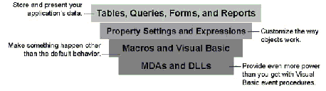 The following illustration shows the building blocks of a Microsoft Access application, starting at the top with the elements you work with most frequently.