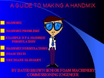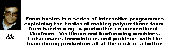 BELOW ARE JUST A FEW OF THE MORE THAN 80 PAGES IN THIS INTERACTIVE PROGRAMME TAKING YOU STEP BY STEP THROUGH MAKING A FORMULATION OF ANY DENSITY FROM 12 TO 45.IT ALSO GIVES YOU THE ANSWERS TO FOAM PROBLEMS AND STANDARD TESTS ON THE FOAM.