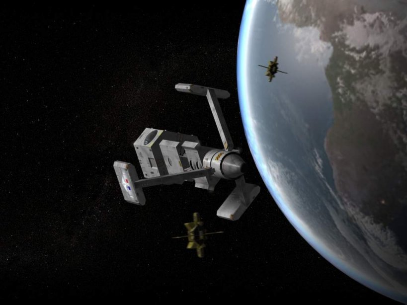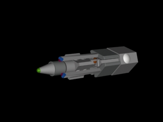 Aft of the spin collar the ship assumes a triangular profile. The first section contains the bridge from which the captain controls the ship. Also in this section is the ship's security station which is under the control of a 20 strong detachment of FUVOLMARS. Security's job during combat is to secure the ship against possible boarding, to conduct boarding operations (often in co-ordination with embarked troops) and to reinforce damage control parties. When the ship is in station the physical and data integrity of the vessel is the responsibility of the detachment commander. There is also a small zero-G science lab in this part of the ship. The next part of the ship contains the 'tactical action centre' where the sensor operators, gunners and remote pilots work. Under the command of the Officier Opérations Spatiales (OOS) they are responsible for fighting the ship to the Captain's orders. Engineering includes the workstations required to keep the ship's engines and systems running perfectly. In addition there are an number of workshops and stores to enable the engineering team to conduct routine repairs and patch battle damage. Heavy stores for embarked troops can are normally found in this location. When the spin habitats are folded down they lock on to the outside of this section and access to them is only through engineering. The final section is dedicated to the ship's massive powerplant and drives. However the rear hull also contains the magnetic slings for the ship's 3 shuttle craft. |
