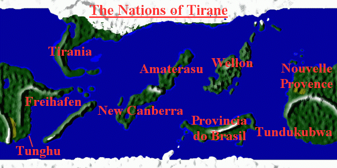 Introduction Welcome to Tirane- Bienvenue a la Tirane! Tirane (Alpha Centauri A I) is humanity's first step beyond the cradle of the Sol system. As such, she has seen many nations and peoples carve out their unique niches in the planet's history. Uniquely alien, yet comfortably familiar to settlers and colonists, Tirane offered a new frontier to explore and exploit, one many took advantage of. Explorers came and made new discoveries, met new challenges, and continue to detail the breadth and depth of Tirane's unique biology and geology. Immigrants came to build new lives, achieve their dreams, and create societies as unique and diverse as Earth itself. However, as humanity's first colony world, Tirane has seen more than her share of human conflict, ignorance, and despair. Requiring armed conflict to open the world to all of humanity, Tirane also represents the inability of Earth's nations to leave their problems at home. In the heady, rugged, chaotic years of the first exploration and colonizing efforts mistakes were made, lives were lost, dreams dashed to dust. Even when plenty was available conflict did arise over undetermined borders and untapped resources. Still, eight nations eventually succeeded in creating viable colonies, accepting immigrants from all corners of the Earth. As a result of this success, other nations built settlements within the various colonies. Some of these eventually integrated with the host colony, while others remain distinctly unique subdivisions. Two of these settlements, however, became separate enclaves beyond the control of the major players. The colonies continued to grow far beyond the expectations of the mother countries, until Tirane became, in many ways, a second Earth. As such, Tirane offers a wealth of opportunities to the 2300AD milieu, the promise of an alien world with the familiar comforts, and challenges, associated with living in the Core. Many Tiraneans are quick to correct those who see their home as merely a copy of Earth, and despite the similarites, they are correct. Indeed, it only takes a look upward to the unfamiliar night sky to know that, yes, Tirane is a unique world. The Tirane Sourcebook is not the vision of one man alone. What is presented here comes from the ideas, brainstorming, constructive criticism, and considerable heated debate of several people, all of which believe that Tirane offers 2300AD gamers a unique setting for campaigns and adventures. As such this will remain a work in progress. New thoughts, ideas, and inspiration will continue to breathe life into Tirane, and we encourage referees and players to come and make their own marks on humanity's first colony world. To paraphrase Buddha, "With our thoughts we create a world." On behalf of my fellow Tiranistas, let me welcome you to Tirane. Scott D. Ash 15 May 2002