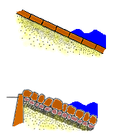 A cheaper alternative to sea walls is the revetment (about £1200 per metre). This is a sloping feature which breaks up or absorbs the energy of the waves but may let water and sediment pass through. The older wooden revetment consists of posts fixed into the beach with wooden slats between. Modern revetments have concrete or shaped blocks of stone laid on top of a layer of finer material. Rock armour or riprap consists of layers of very hard rock with the largest, often weighing several tonnes, on the top. Riprap has the advantage of good permeability plus it looks more natural. |