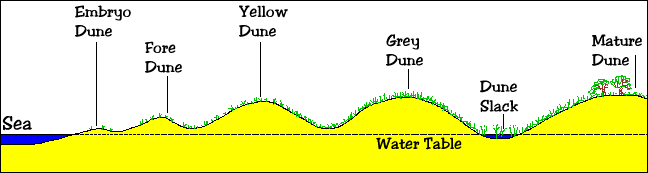 The sand dunes show a typical transect with low embryo dunes near the shoreline and much taller mature dunes several hundred metres back from the shore. As you follow the transect from the beach, the dunes get older and the vegetation changes, gradually covering more and more of the bare sand.