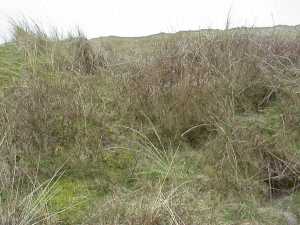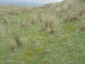 The grey dunes are much more stable and mosses and lichens fill the few remaining spaces between plants so that vegetation cover may reach 100%. Marram grass becomes less common and appears now in isolated patches. Red fescue, sand sedge, sea spurge begin to dominate. Small shrubs (brambles, gorse, buckthorn) appear for the first time. Environmental conditions 50-100 metres from the sea are much more friendly. There is shelter from the harshest winds, humus is beginning to darken the surface layers and a true soil begins to form. Soil pH is increasingly acid and heathers may take advantage of the acid conditions. Water content is still low and plants have to search for water with their spreading root systems. These large dunes are commonly 10 metres in height and wider than those dunes nearer the shore. |