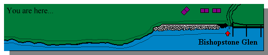 You have now arrived at Bishopstone Glen. Here, a small stream has cut a valley through the cliffs and created a gap. A set of wooden steps takes you back up on to the clifftop for the walk back to Reculver. Picture 'a' shows Bishopstone Glen from the lower part of the beach looking southwards. The large rocks protecting the soft cliffs from erosion can be seen on the left. Picture 'b' shows the valley closer up and the stream can be seen disappearing into the coarse, shingle ridge at the top of the beach. Occasionally, the stream has enough power to wash away the shingle and run directly into the sea but eventually the storm waves rebuild the beach. Picture 'c' is a view looking westwards from Bishopstone Glen. Once again, the coast is heavily defended and there is a concrete sea wall with a wide promenade fronted by a regular series of wooden groynes to slow down the longshore drift. The reason for this is that the area above the cliffs has increasing numbers of houses as you progress towards the town of Herne Bay. Picture 'd' is looking eastwards back along the beach. It shows the effectiveness of the large boulders (rip-rap) which are protecting the cliff. Vegetation is beginning to colonise the more stable slopes. |